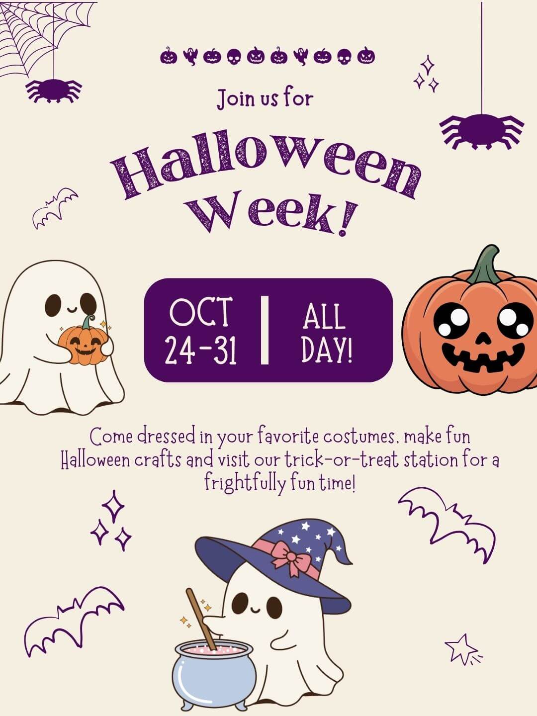 Halloween fun starts here! Beginning October 24th, come dressed in your favorite costumes, create fun Halloween crafts, and visit our trick-or-treat station for a spooky good time!